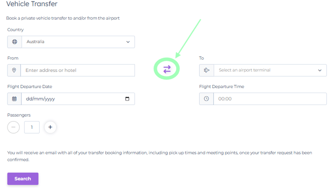 - By default, the pickup location is an address and the drop off location is an airport. If you’d like to be picked up from the airport, click the double arrow button to swap the entry fields to allow choosing an airport as the pickup location.